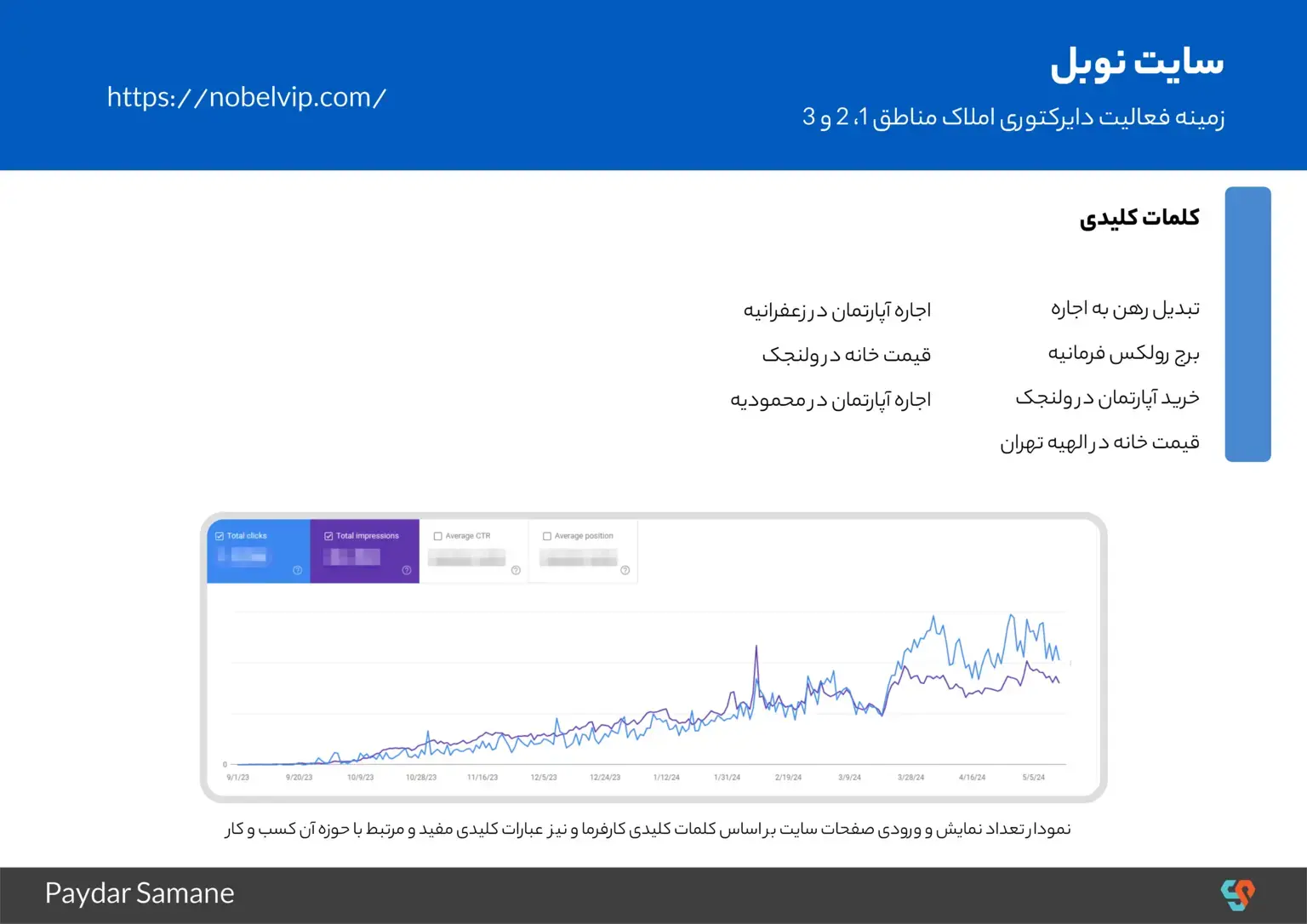 با هدف افزایش دیدهشدن و رقابت مؤثر در بازار آنلاین، مدیریت املاک نوبل از خدمات سئو و دیجیتال مارکتینگ ما بهرهمند شد. نتیجه این همکاری، رشد چشمگیر جایگاه وبسایت املاک نوبل در جستجوهای گوگل و جذب مشتریان جدید بود؛ دستاوردی که موجب رضایت کامل مدیریت و تیم این مجموعه شد.