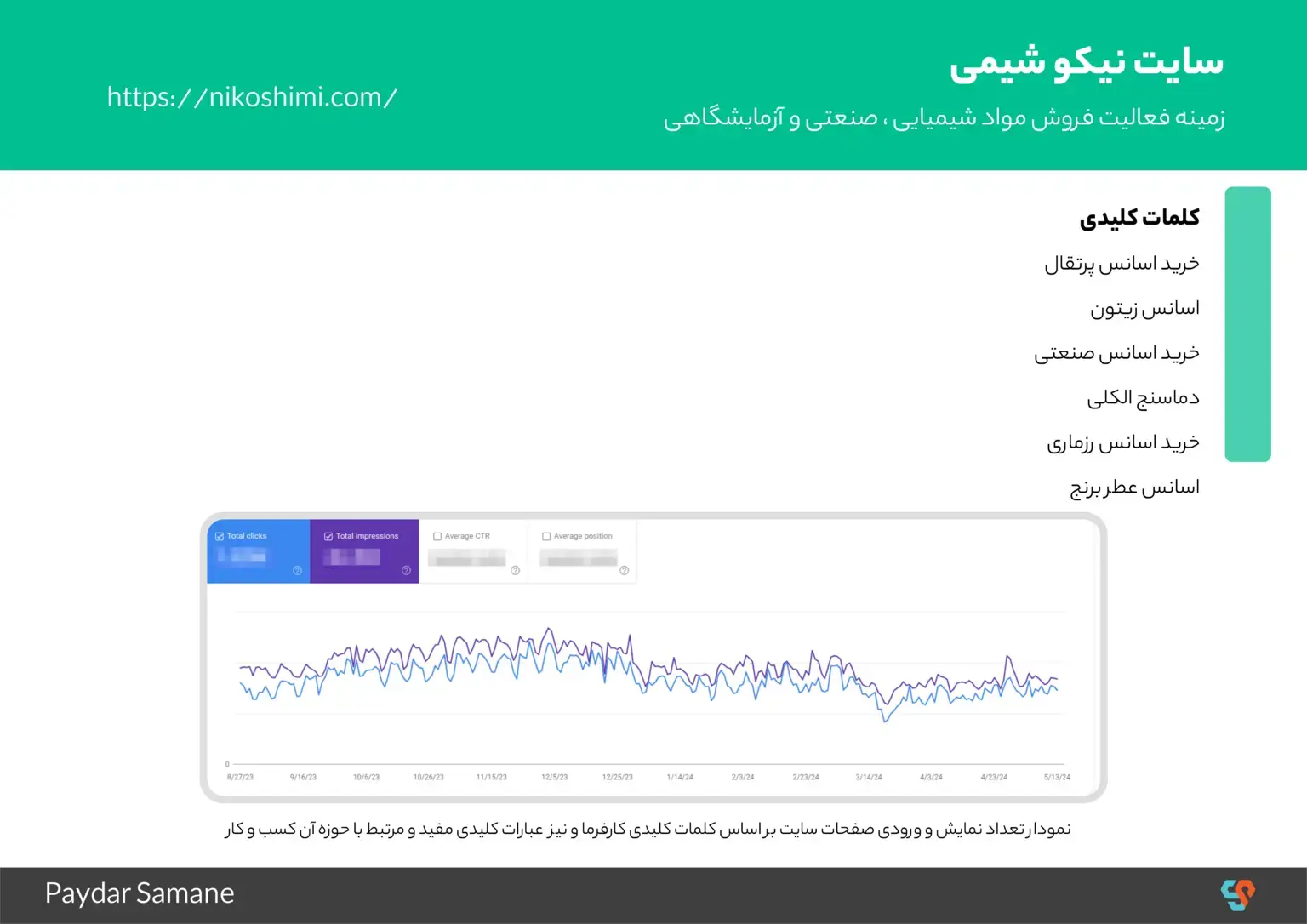 با هدف گسترش بازار آنلاین و افزایش دیدهشدن در گوگل، آقای ارجمندی از خدمات سئو و دیجیتال مارکتینگ ما بهرهمند شدند. نتیجه این همکاری رشد چشمگیر ورودیهای ارگانیک سایت و بهبود رتبه در کلمات کلیدی مهم بود؛ موفقیتی که رضایت کامل مدیریت و تیم نیکوشیمی را به همراه داشته است.